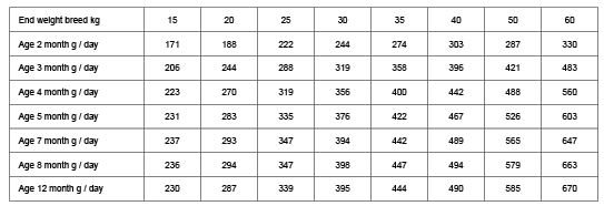 Feeding recommendation: see table. The daily ration may vary depending on energy requirements and climatic conditions.